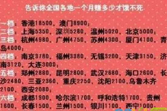 “你一個(gè)月賺多少錢才餓不死?”面對(duì)漲薪、加班、亞健康等“職場(chǎng)PM2.5”,不少80后、90后求職者揮起了跳槽的旗幟。近日,網(wǎng)絡(luò)流傳一份全國各個(gè)省份的工資水平名單,鄭州以月薪2880元位居第五檔,在中部幾個(gè)省份屬于偏高階層。